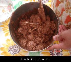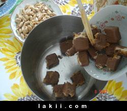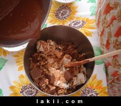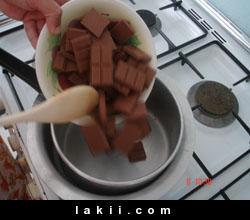ونخلط الشوكولاته مع الزيت في وعاء صغير على نار هادئه الى ان يلين و و يترك ليبرد خمس دقائق.