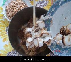 ثم يضاف خليط الشوكولاته على خليط السنكرز و يخلط