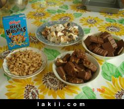 4 سنكرز (60 جم للواحد) + كوب Rice Krispies+150 جم مارشمالو مشوي مقطع +كوب فول سوداني غير مملح محمص + 400 جم شوكولاته بالحليب مقطعه + ملعقتان شاي زيت
