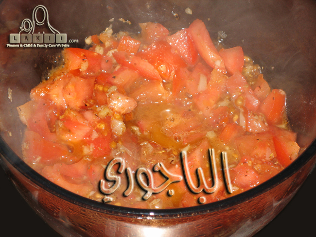 ثم نضيف مكعبات الطماطم دون ان يتغير لون الثوم ونقلب