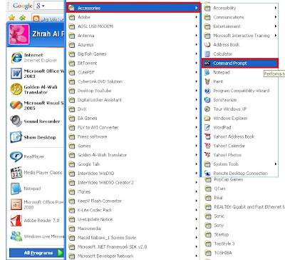 3. وأشر إلى البرامج الملحقة accessories، ومن ثم انقر فوق موجه الأوامر DOS.